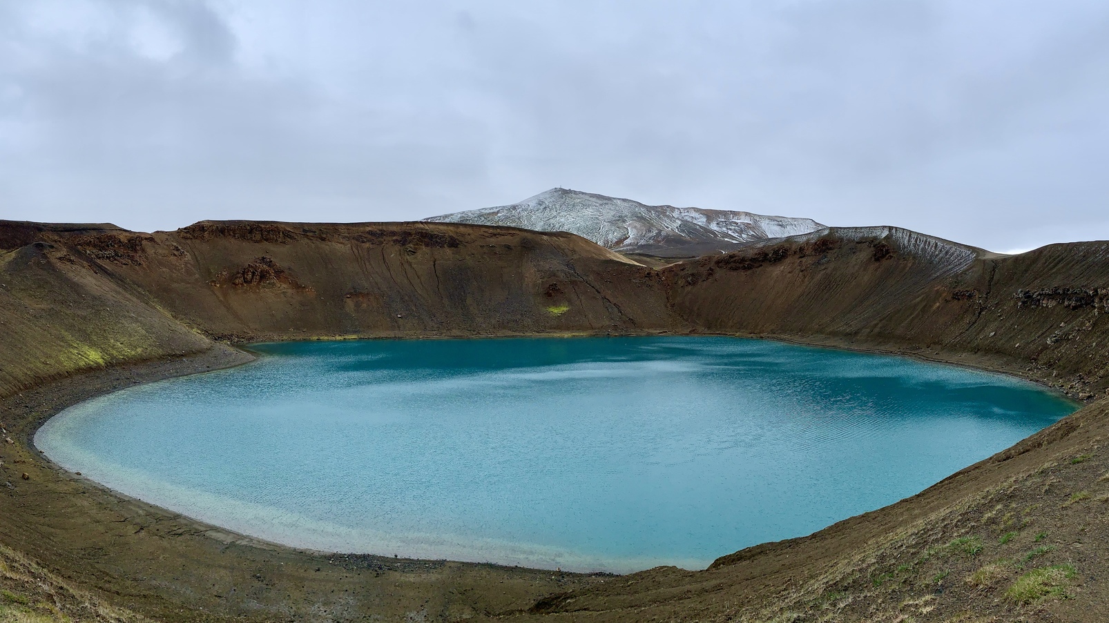 Kerid is een vulkanische krater die is ontstaan na een grote vulkaanuitbarsting, waarbij de top instort en een komvormige krater achterlaat. Kerid is een plaatje om te zien. De kraterwand heeft verschillende tinten rood, bruin, groen en geel, wat een mooi contrast is met het blauwe water. Je kunt een rondje lopen over de rand van de krater, maar je kunt ook naar beneden om rond het meer te lopen.